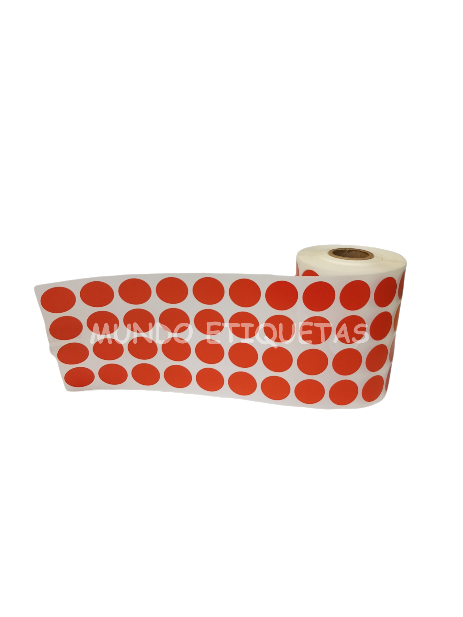 Rollo con 5000 etiquetas autoadhesivas color rojo, circular de 20mm con 4 salidas en cono de 1 pulgada.