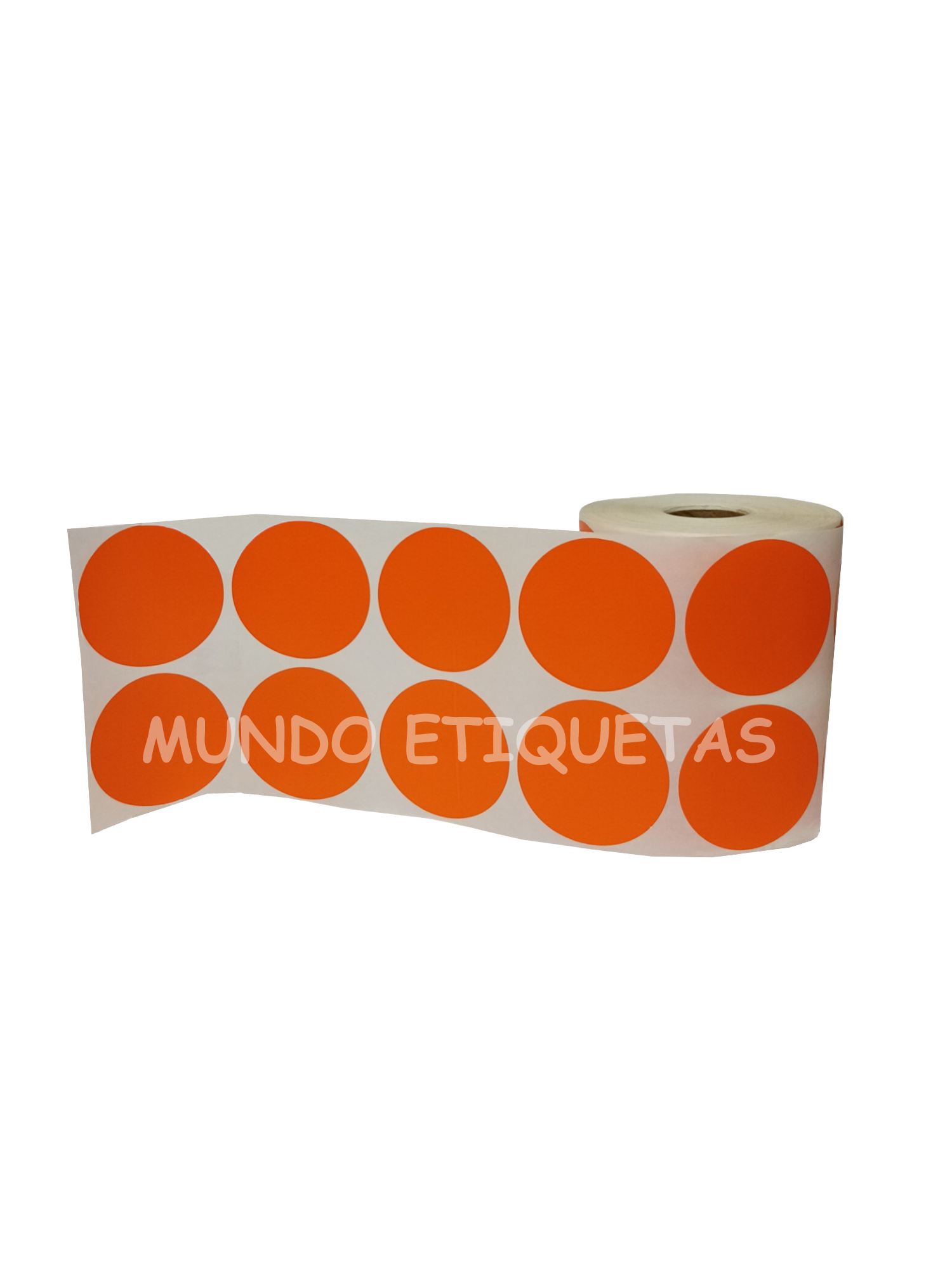 Rollo con 1600 etiquetas autoadhesivas color naranja, circular de 50mm con 2 salidas en cono de 1 pulgada.