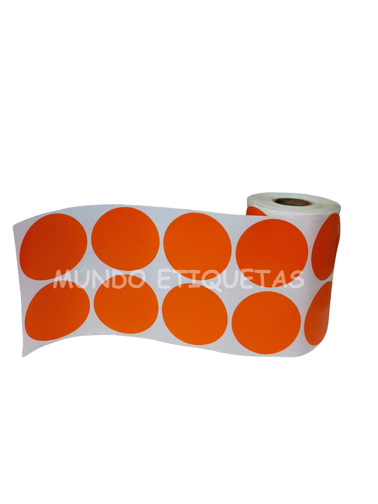 Rollo con 800 etiquetas autoadhesivas color naranja, circular de 50mm con 2 salidas en cono de 1 pulgada.