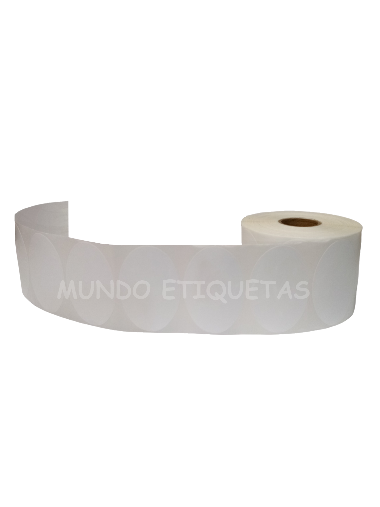 Rollo con 1000 etiquetas autoadhesivas color blanco, ovaladas de 40mm de alto x 60mm de ancho con 1 salida en cono de 1 pulgada.